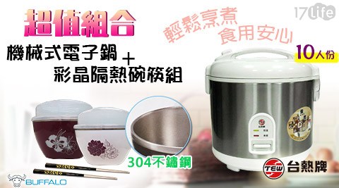 只要969元起(含運)即可購得【台熱牌】原價最高3240元機械式電子鍋10人份(T-777)系列:(A)電子鍋1台/(B)電子鍋1台+【BUFFALO牛頭牌】彩晶隔熱碗筷組1組;電子鍋享1年保固。